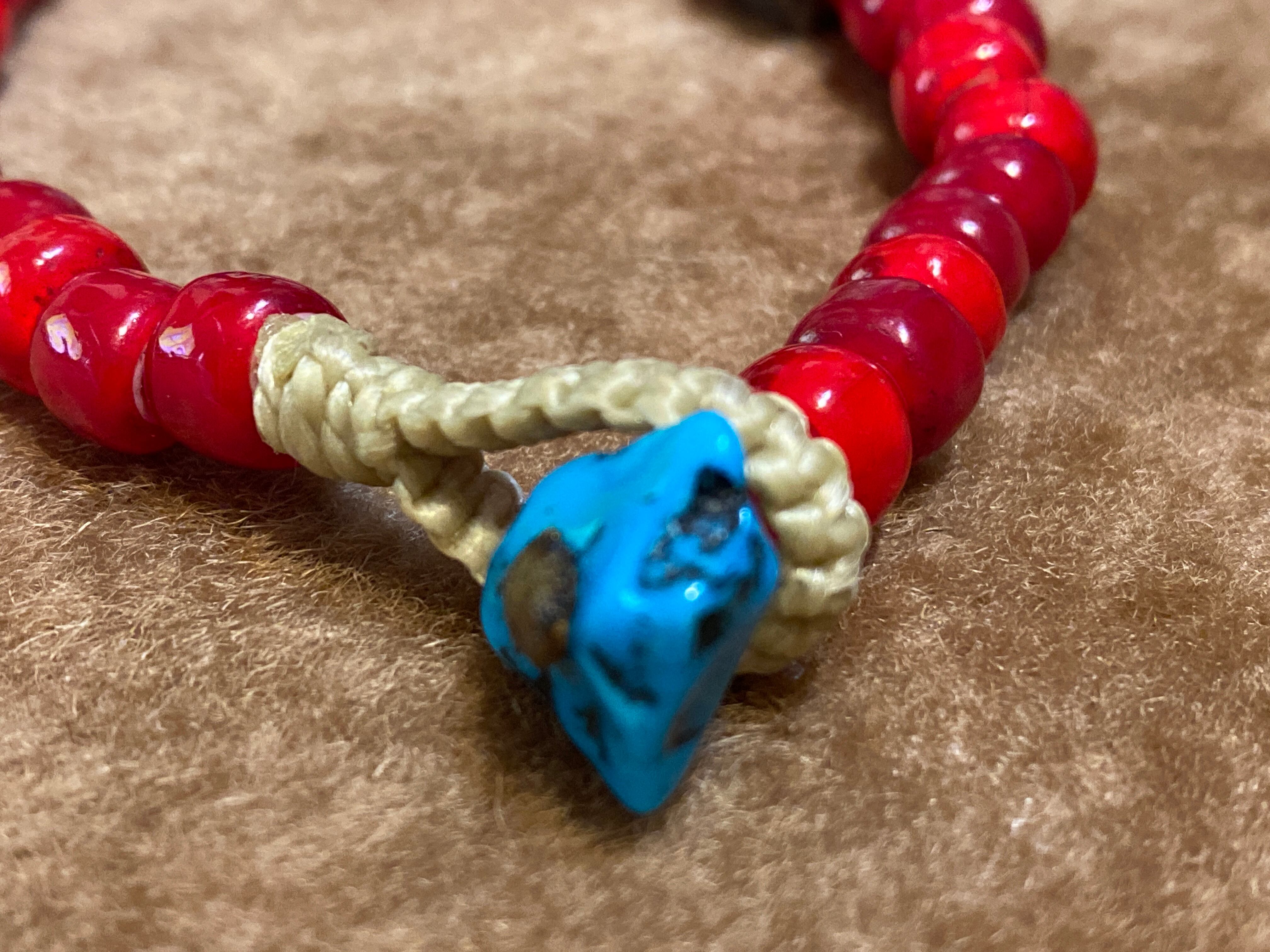 ターコイズとアンティークビーズを合わせたブレスレットです。紐は生成色のロウビキの紐です。