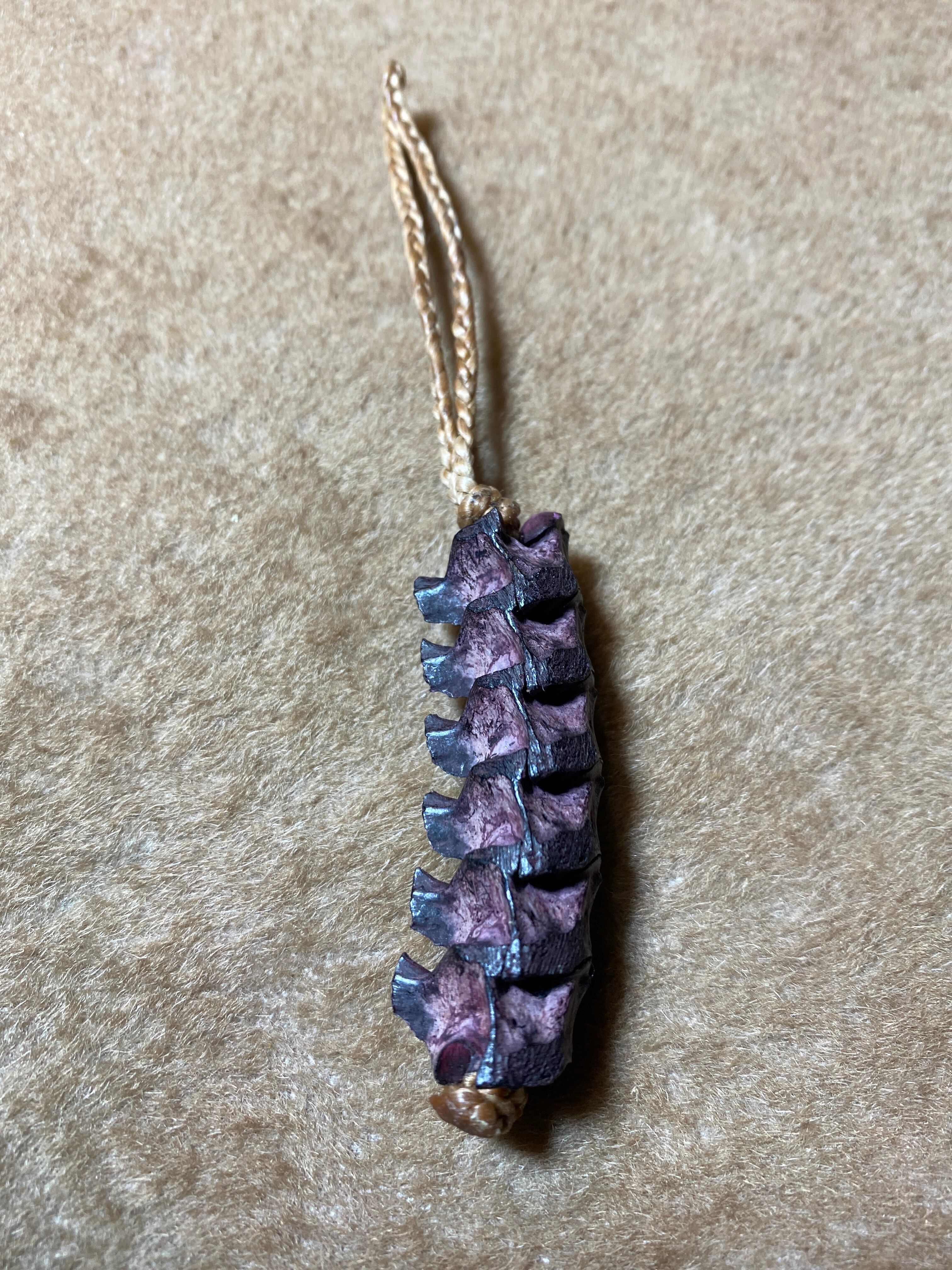ヘビの骨とロウビキの紐を使ったキーホルダーです。