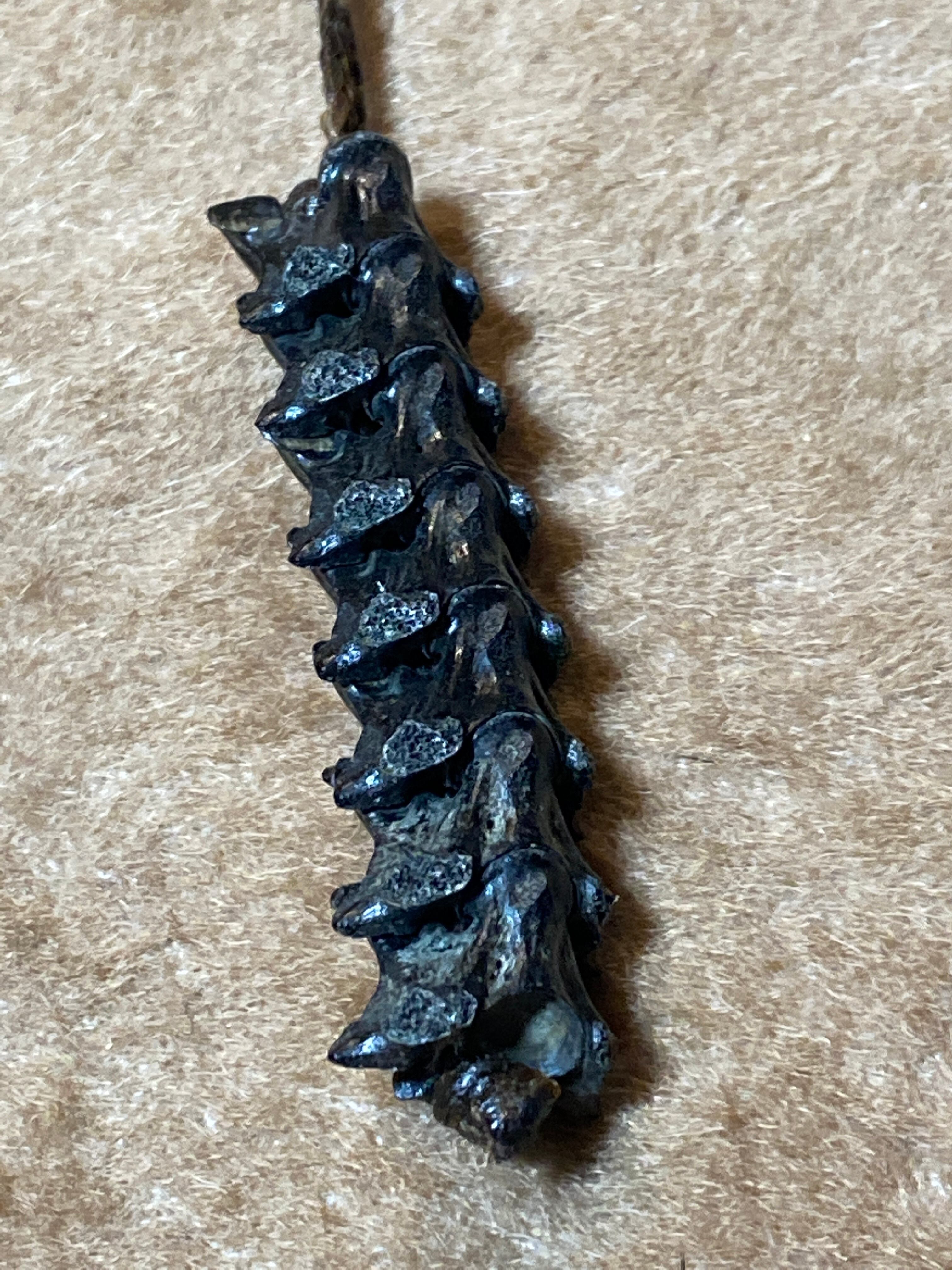 ヘビの骨とロウビキの紐を使ったキーホルダーです。