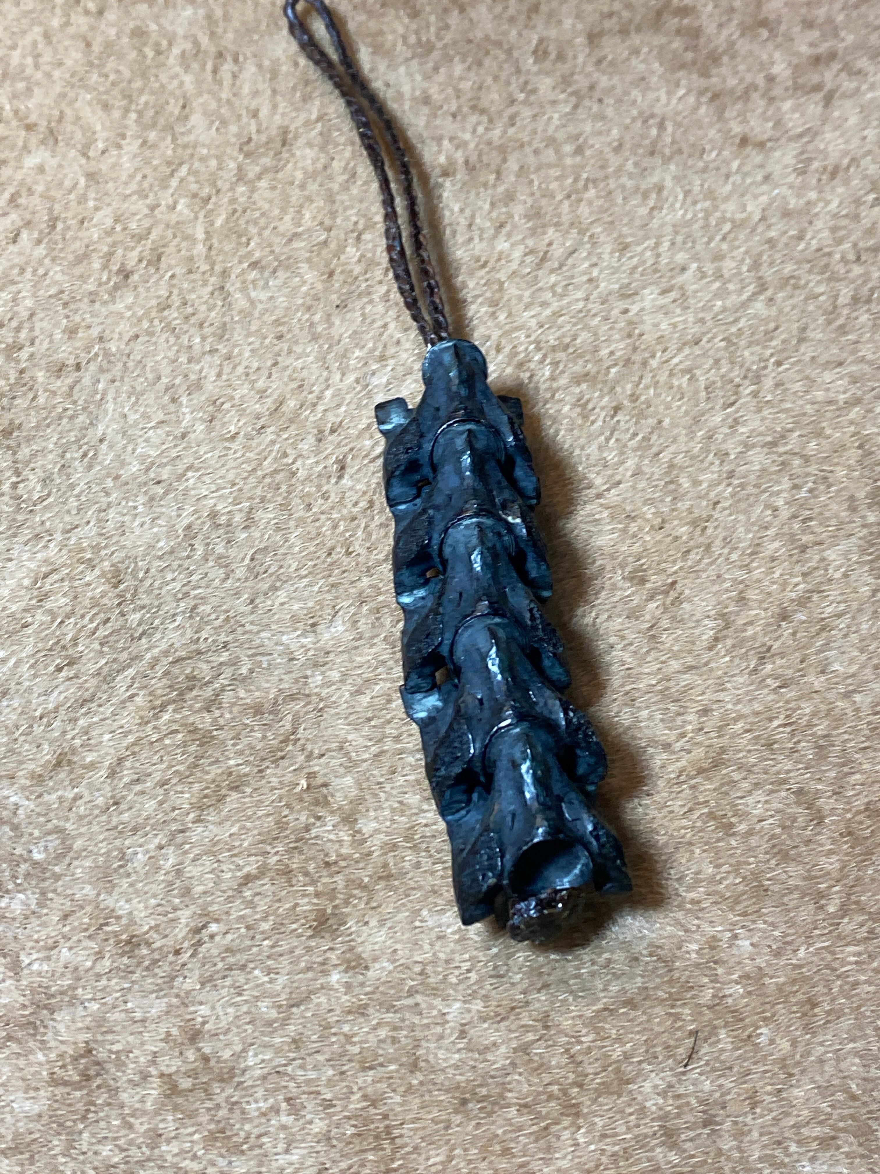 ヘビの骨とロウビキの紐を使ったキーホルダーです。