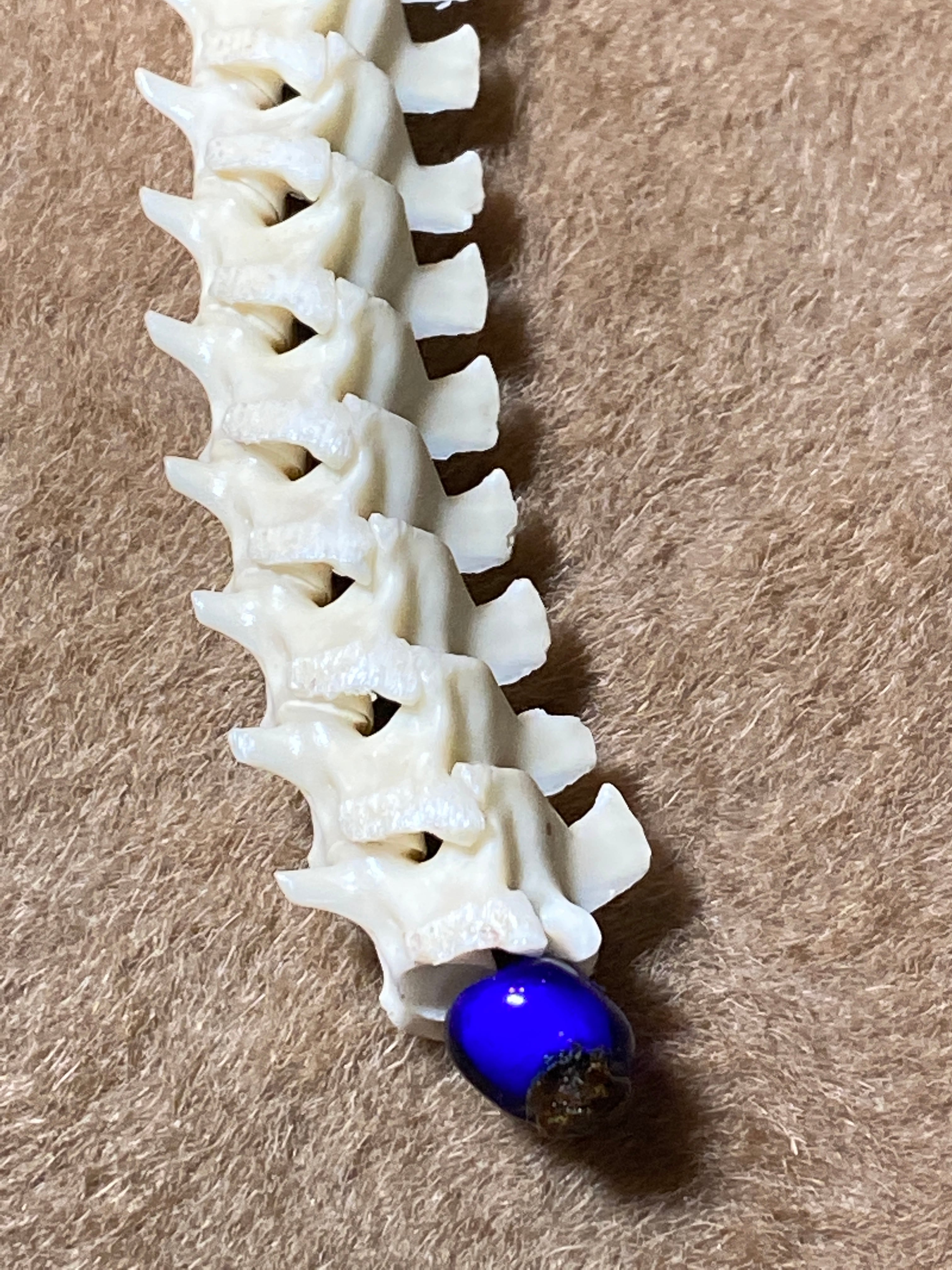 ヘビの骨とブルーアンティークビーズとロウビキの紐を使ったキーホルダーです。