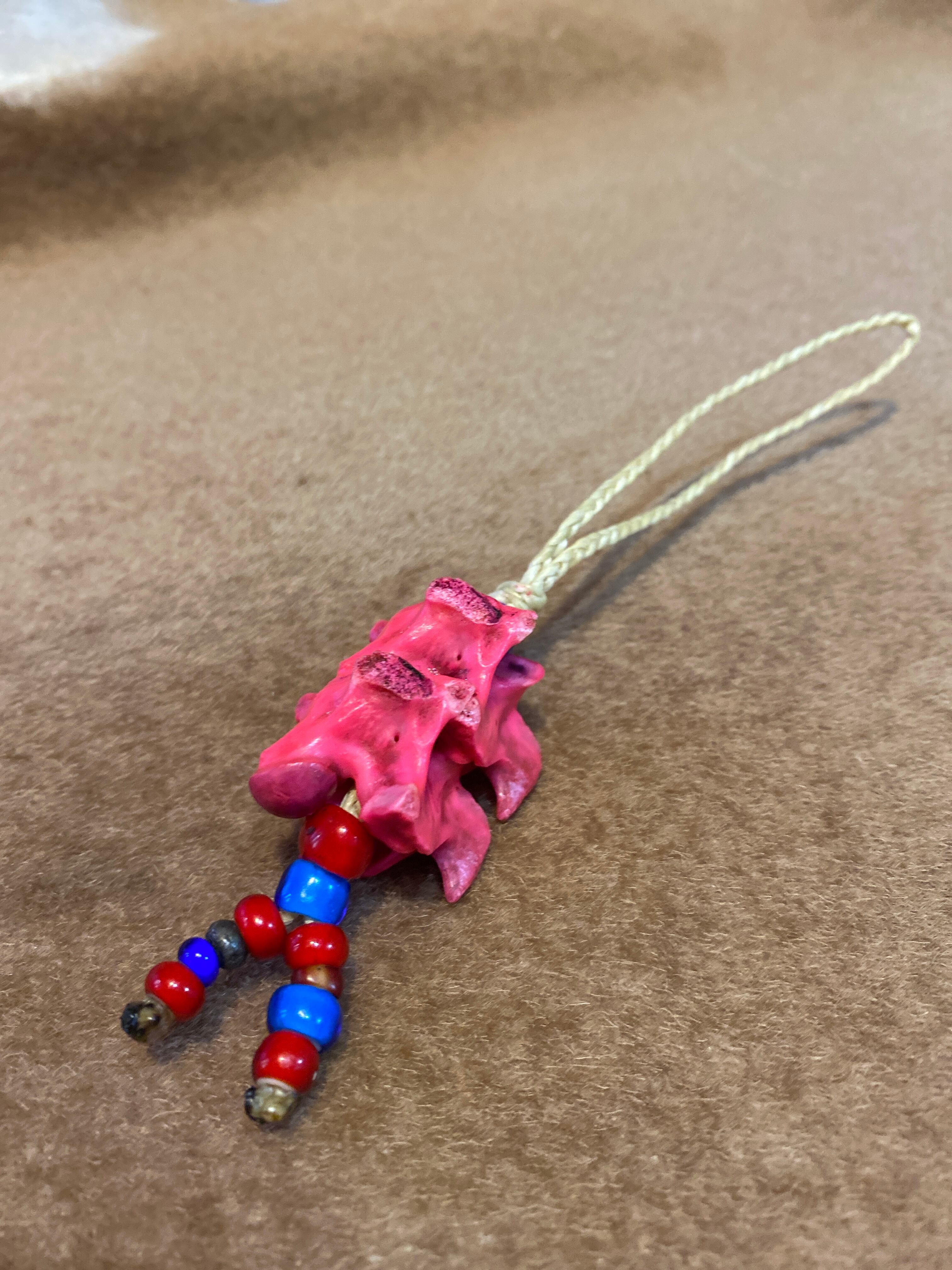 ヘビの骨とアンティークビーズ、ロウビキの紐を使ったキーホルダーです。
