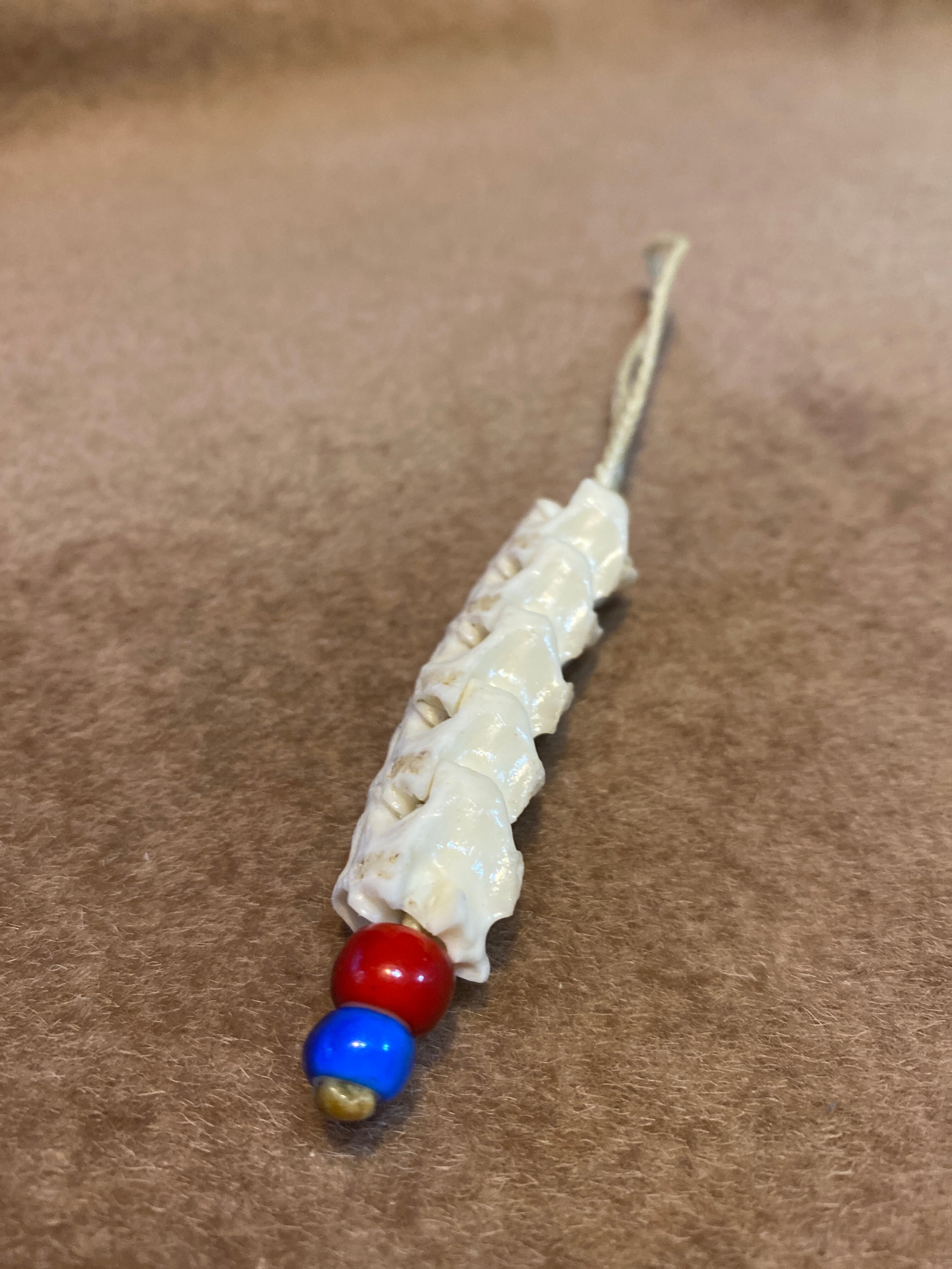 ヘビの骨とアンティークビーズ、ロウビキの紐を使ったキーホルダーです。